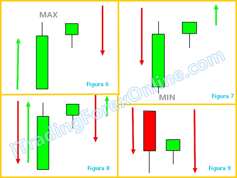 In caso di trend ribassista e raggiungimento di minimo relativo, quindi visione opposta alla precedente, il movimento del prezzo successivo all’inside sarà prima verso il basso, talvolta anche oltre al minimo dell’inside e poi di corsa verso l’alto. Lo stesso movimento avverrà nel caso di presenza di trend rialzista o breakout.