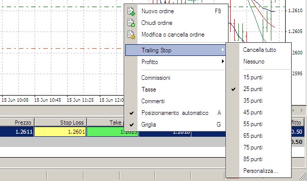Per impostare il trailing stop con Metatrader 4 basta cliccare sulla posizione aperta con il pulsante destro e nel menu la voce trailing stop con i punti standard disponibili. Tale funzione però è disponibile soltanto se la piattaforma resta aperta.